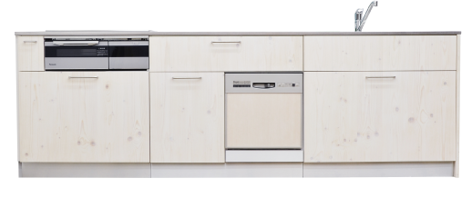 マテリアキッチンは、無垢の木材による3層パネルを面材に使用しています。無垢の木といえば、湿気によって反ったり歪んだりといった弱点が指摘されていました。しかし3層パネルは、無垢の木を3層に集成・接着することで弱点を克服。ねじれや反りを防止し、キッチンでも快適に使用できるよう工夫をこらしました。樹種はスプルース材とオーク材を使用し、6種類より仕上げのバリエーションをお選びいただけます。表面に木目をプリントしただけの板とはまったく異なる、美しい木そのものの肌触りと存在感をぜひお楽しみください。また、永く使い続けることで木肌の表情が経年変化を見せ、より愛着がわく。そんな自然のぬくもりが嬉しい、無垢の木のキッチンです。