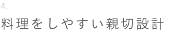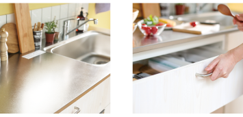 マテリアキッチンは料理がしやすい親切な設計をこころがけました。シンクはシンプルなステンレスシンクを採用し、浅型の排水トラップによりシンク下の引き出し収納スペースを確保。落ち着いたマット感のある仕上げの天板は、厚みが20mmと薄く、フラットな形状でシャープな作りに仕立てました。センターキャビネットは食洗機を下に配置することで、収納量を確保するとともに、より料理がしやすい環境になっています。また、すべてのキャビネットに内引き出しを装備し、コンロキャビネットの内引き出しには、ペットボトルが自立した状態で開閉できる高さを確保。調味料も立てたまま収納が可能です。引き出しはすべてソフトクローズ仕様なので、ゆっくりと元に戻り、使い勝手も抜群。ローラーレールにより高齢の方でも力を入れることなく軽く引くことができます。調理の時間を気持ちよく過ごすための、そんな小さな工夫が、マテリアキッチンの特徴です。