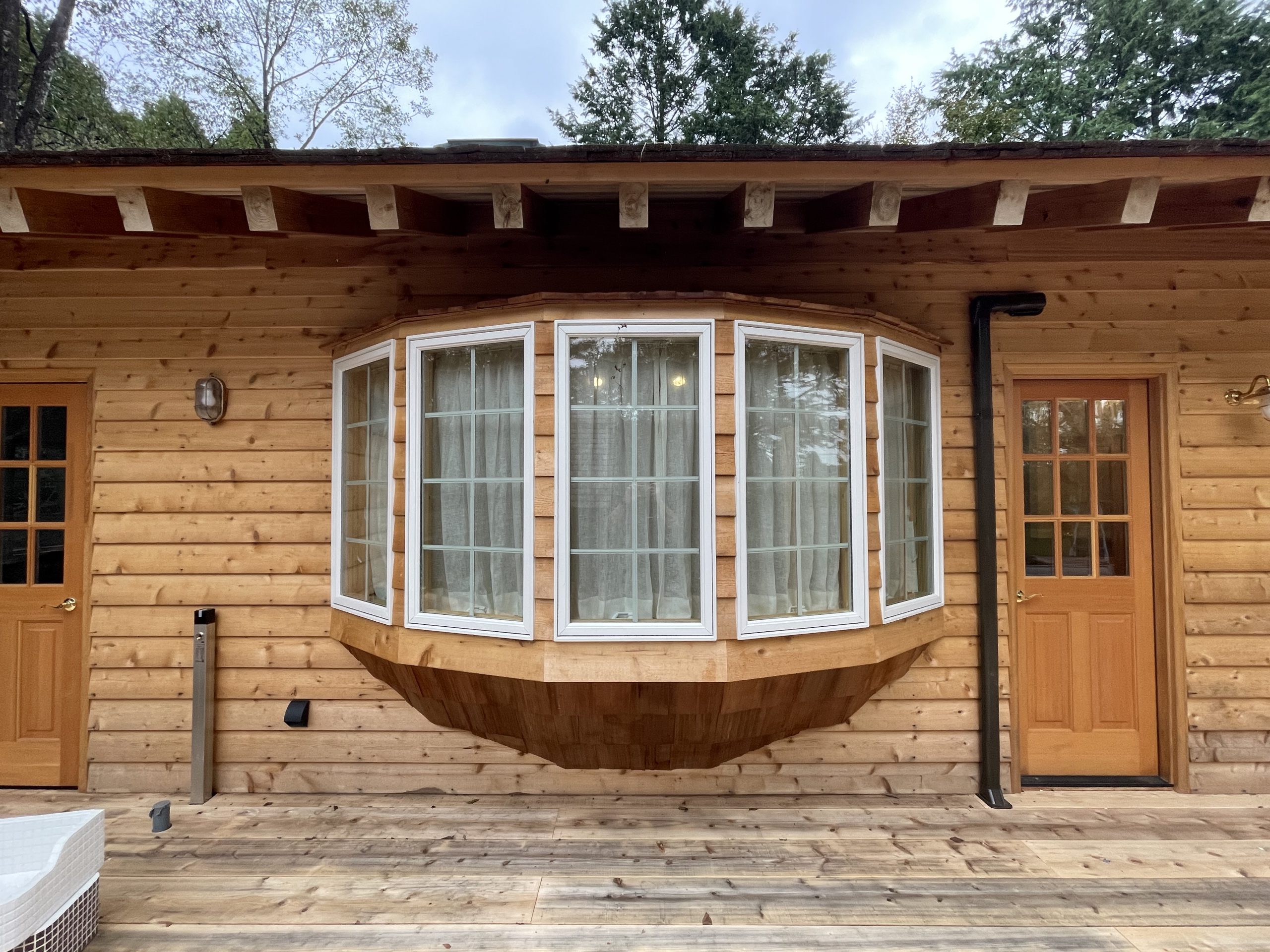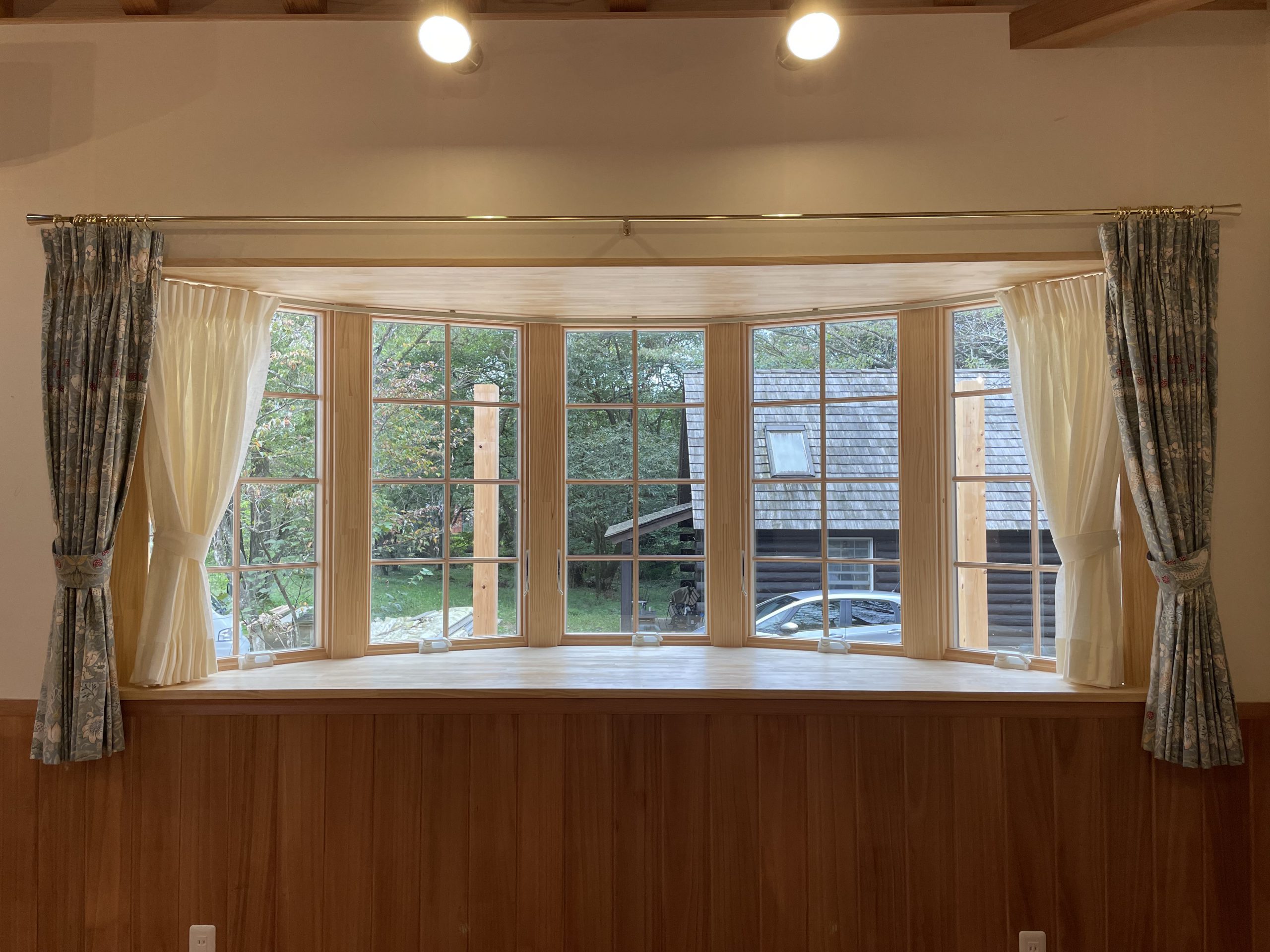 上記アンダーセン木製サッシを室内側から見た写真。 ケースメント(縦滑り)窓を繋げて出窓仕様にしています。