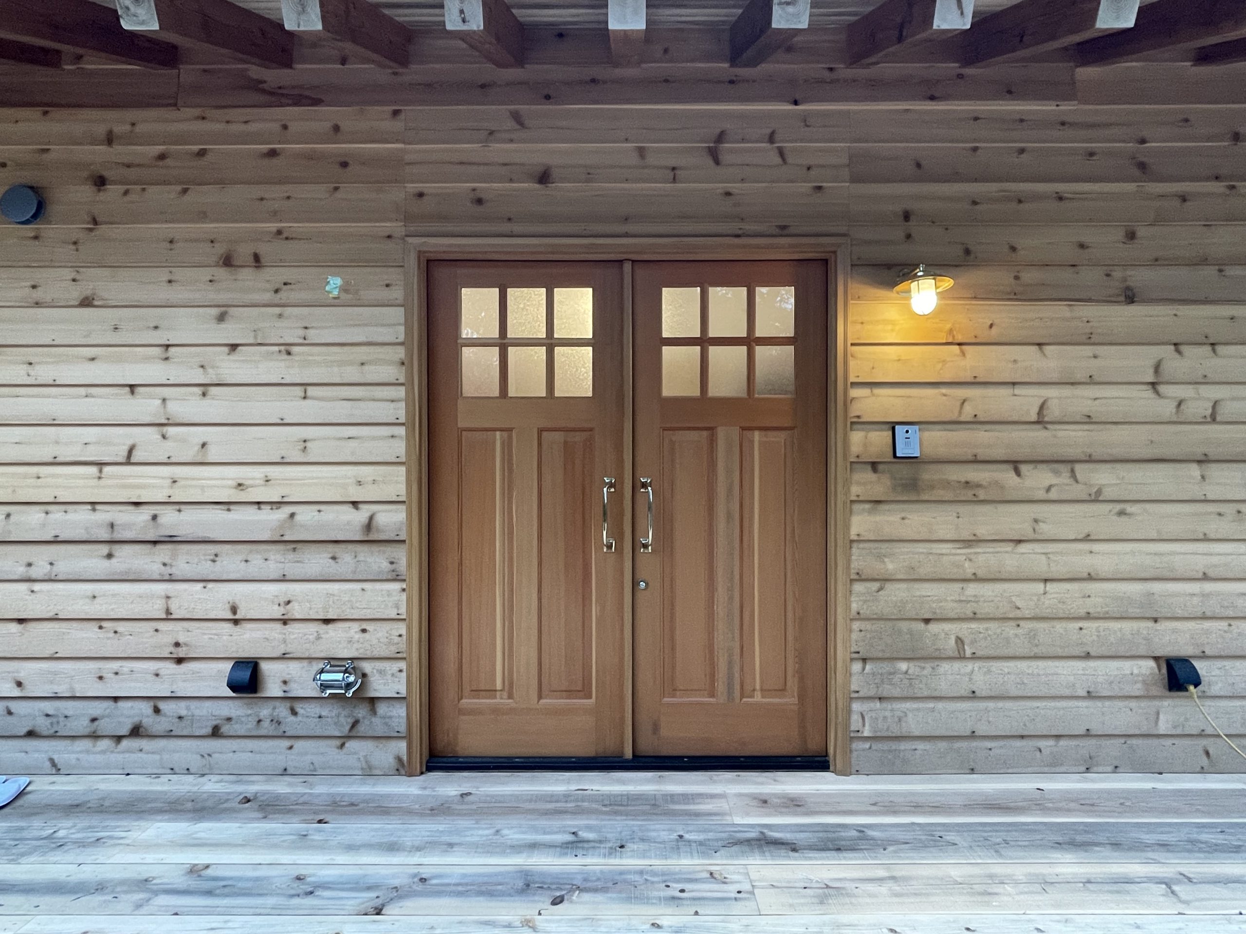 ●外部ドア・・・アメリカ/シンプソン社の木製ドア。材種は米松を使用しているので対候性があります。