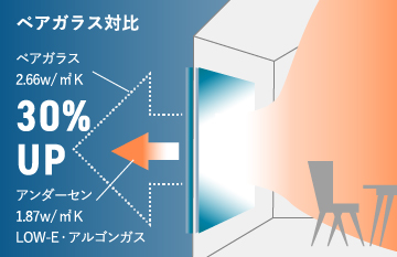 断熱性能1.62W/㎡・K(ケースメント)JIS A4710規格。通常のペアガラスに比べ30%の断熱性能向上。※アンダーセン社調べ。その他の商品の熱貫流率については各商品ページでご確認ください。