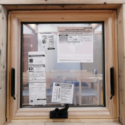 ガラスの外・内側に保護フィルムが貼られて出荷されます。それにより建築現場、配送でのキズを防ぎます。